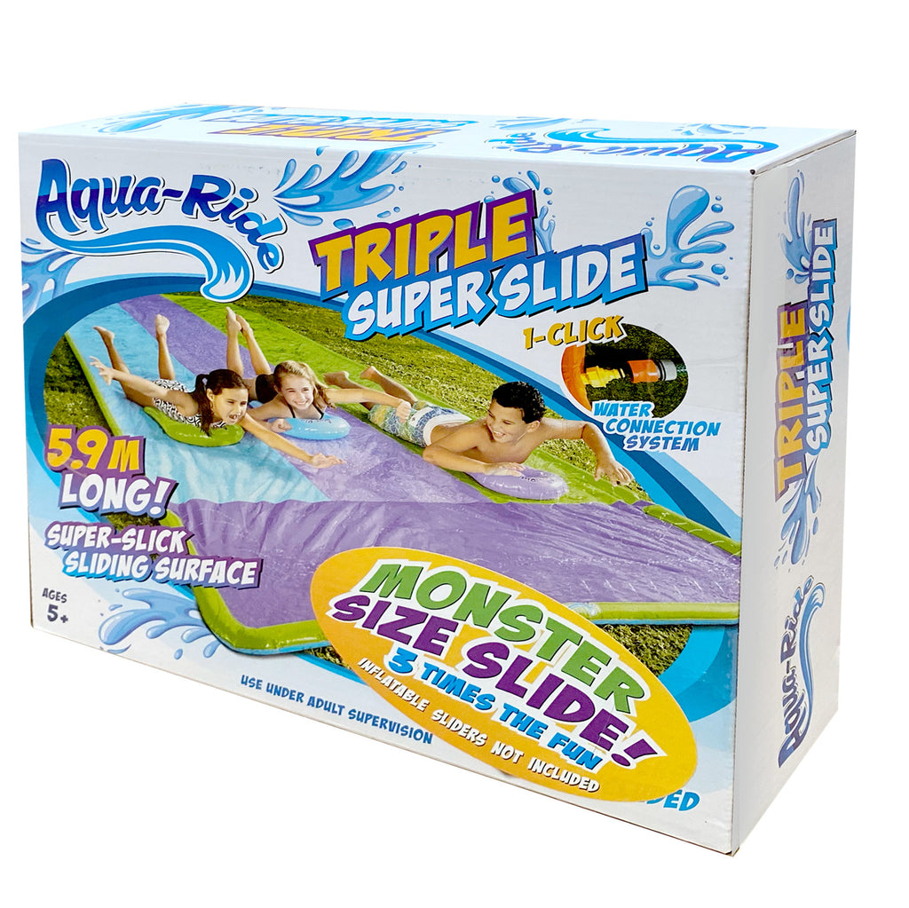 Aqua Triple Water Slide and drench pool for splash landing. Built-in cascading sprinklers keep lanes slick. Connect a garden hose and GO. Perfect for kids, ages 5+. Contents: 1 water slide, 1 repair patch. Size: 18 ft. (5.48 m) in length.