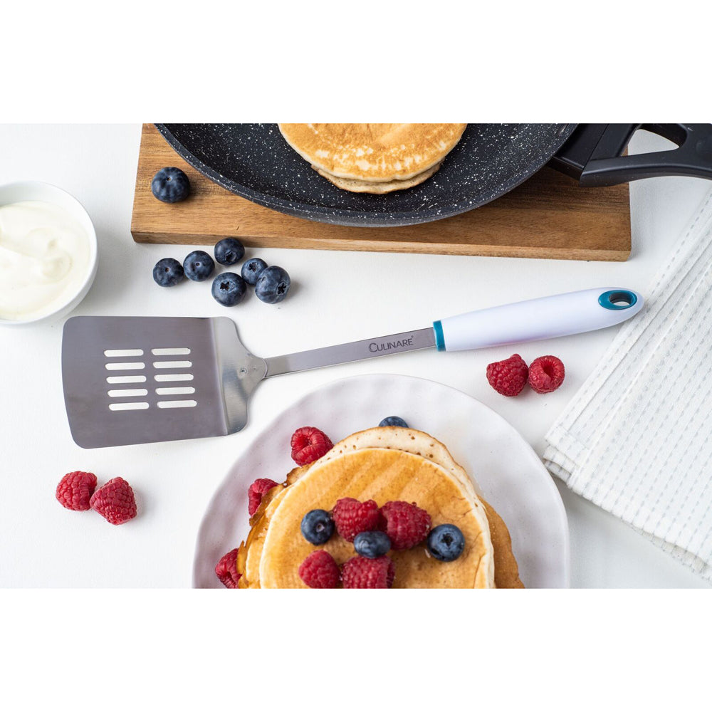 The Culinare Slotted Turner has slots running from top to bottom allowing juices and other ingredients to drain food. The stainless steel is extremely robust and suitable for high heat cooking. Each tool has a comfortable handle design with a hole for hanging. To clean, simply pop in the dishwasher.