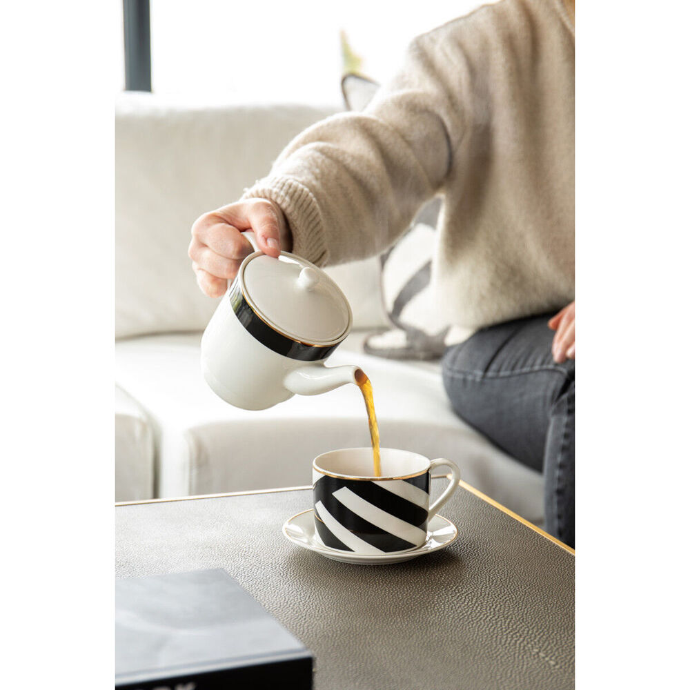 - Each piece is made from delicate fine china that’s accentuated with a genuine gold rim and black stripe to elevate afternoon tea or after-dinner coffee.
