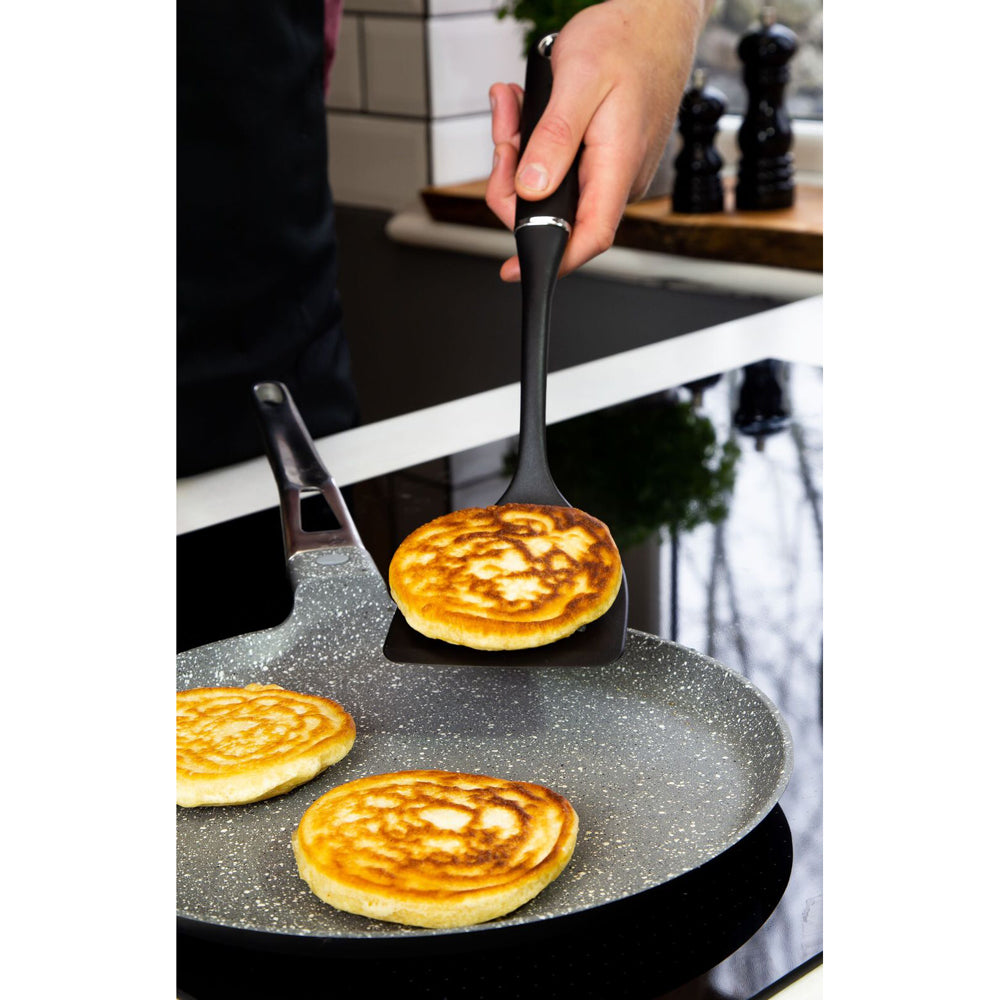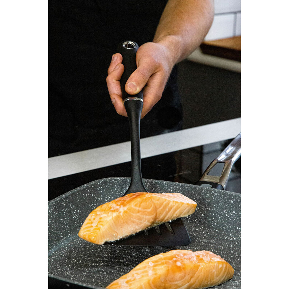 The large, flat head easily slides under most foods, so you can lift them without damage – whether it's crisp butterscotch biscuits on a baking tray, or a sea bass fillet sizzling in the frying pan.
