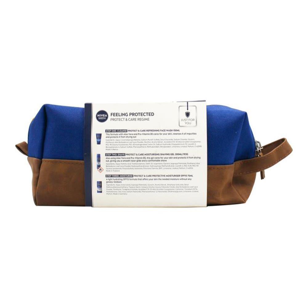 Protect & care for your skin with this NIVEA MEN everyday grooming regime. This gift pack contains all your everyday products so you can keep looking fresh. This grooming pack includes the best of the NIVEA MEN Protect & Care range to keep your skin looking and feeling great: 1x NIVEA MEN Protect & Care Refreshing Face Wash 150ml, 1x NIVEA MEN Protect & Care Moisturising Shaving Gel 200ml/193g, 1x NIVEA MEN Protect & Care Moisturiser SPF15 75ml. These full-sized products are packed in a quality toiletries bag. The perfect gift idea for all round care.