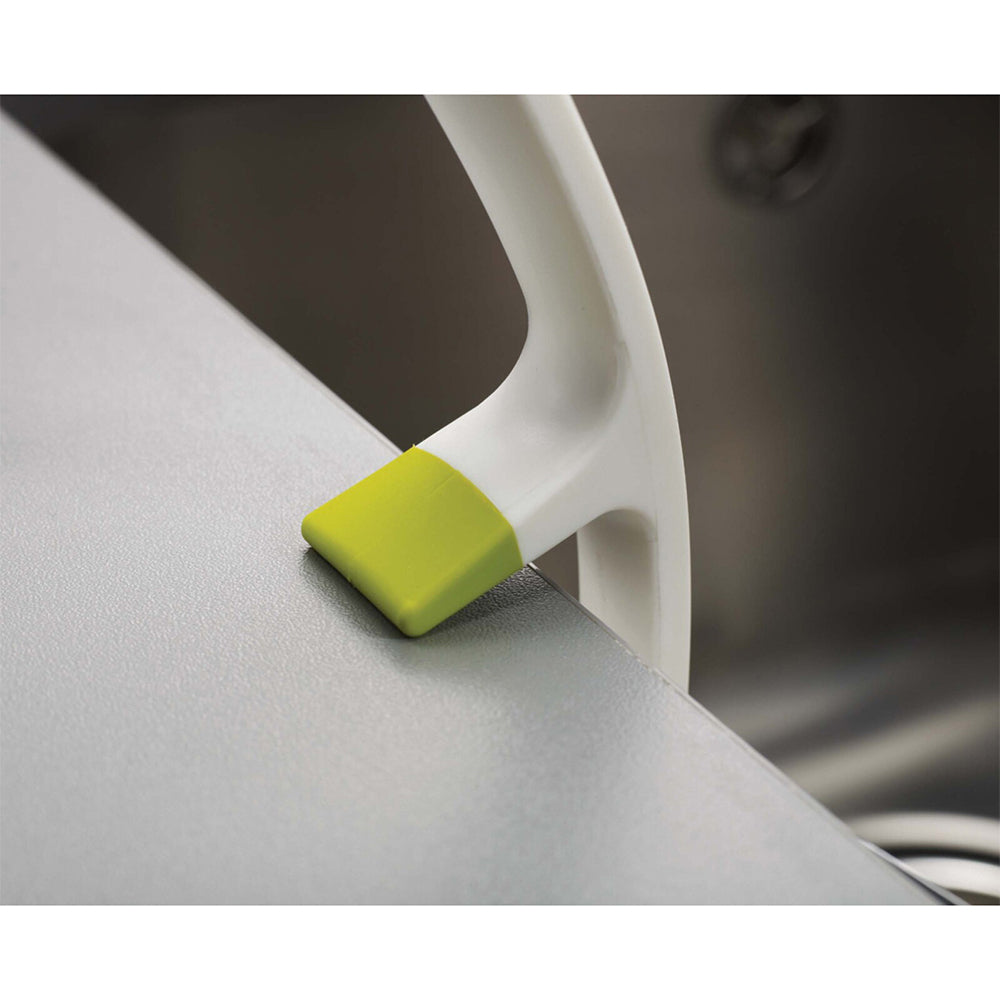 This distinctive dish brush helps make full use of space around the sink by conveniently storing inside it. The design has a non-slip resting point that enables it to be stored on the inside edge of the sink, thereby saving space and allowing excess water and soap suds to drain neatly away. The non-scratch brush head is curved to help clean in the corners of trays and pans and has an integrated pan scraper for tough food deposits. Dishwasher safe.