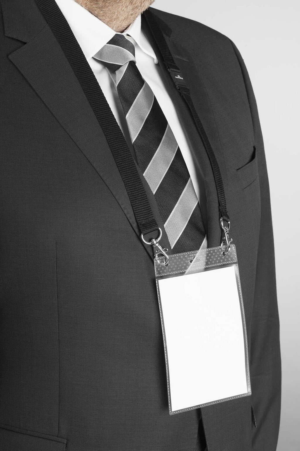 Polypropylene A6 event name badge holder with textile necklace. Ideal for equipping large numbers of guests at conferences, fairs and trade shows.