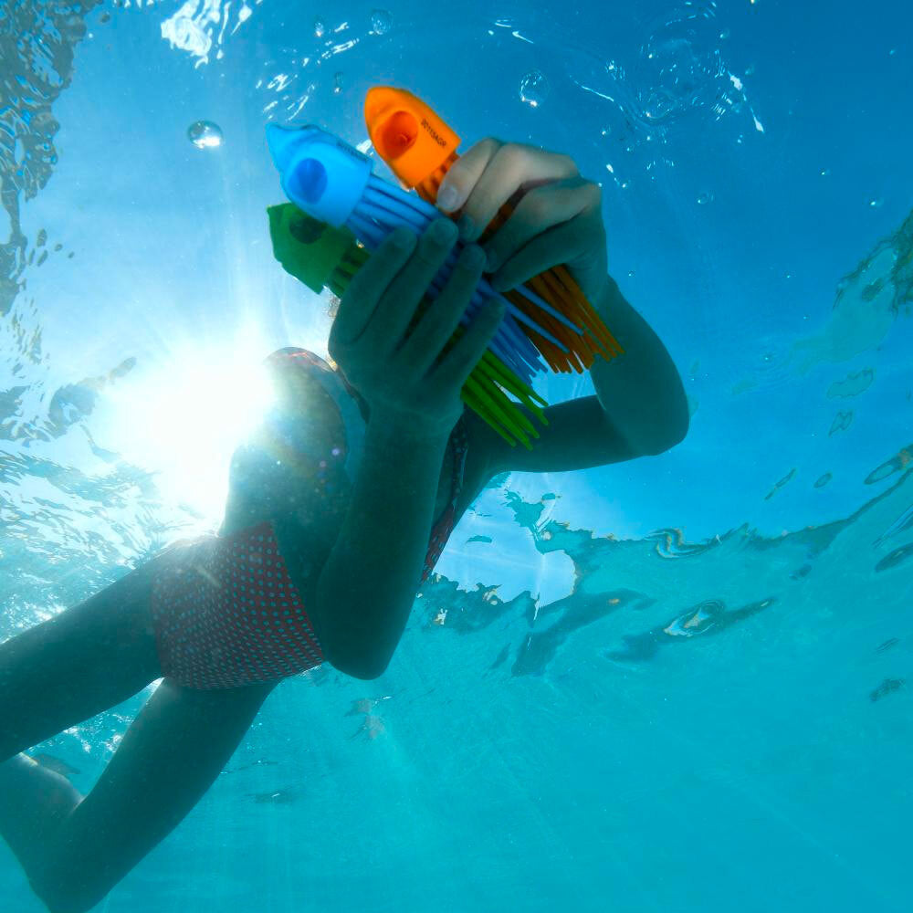 - These soft and flexible pool toys land nose down at the bottom of the pool.