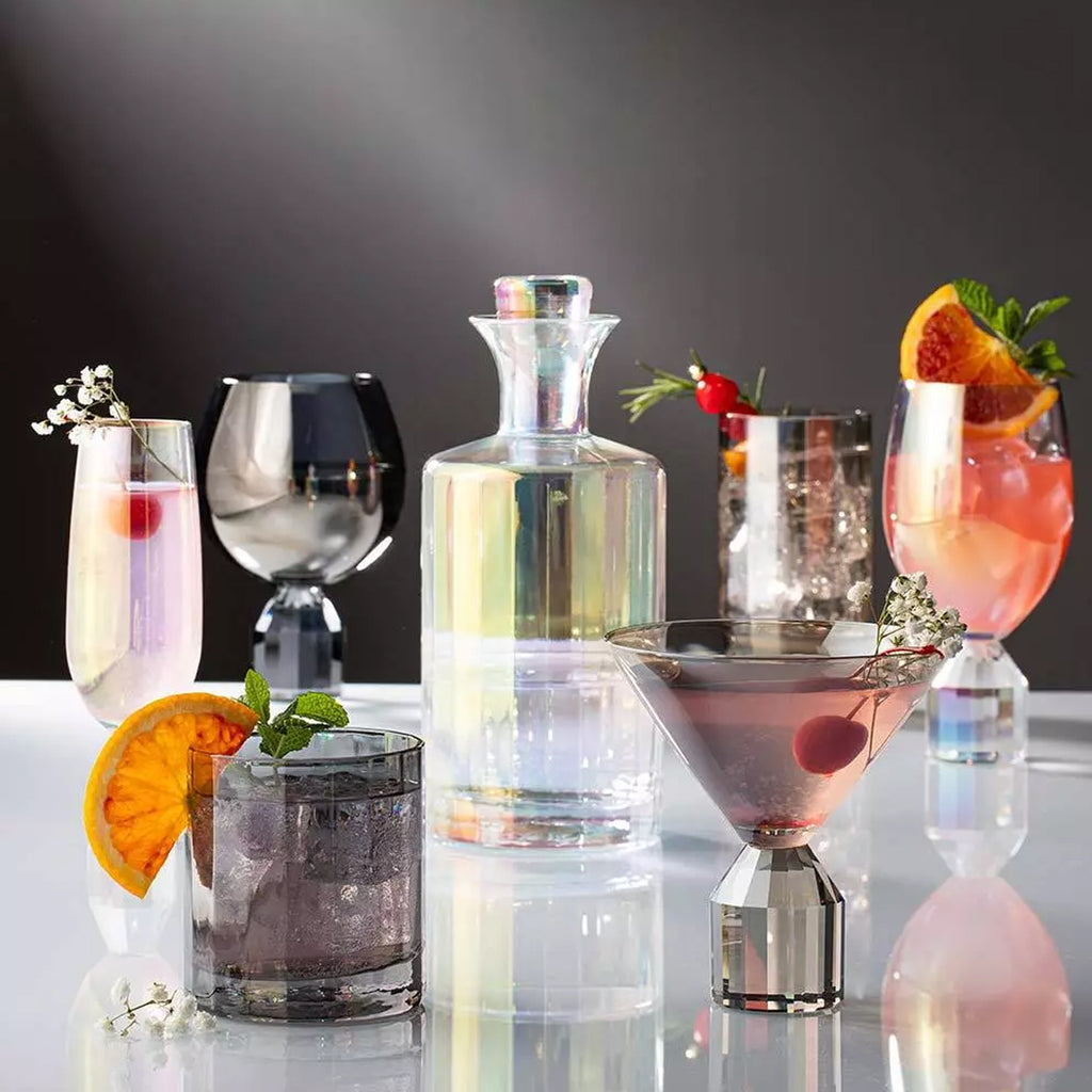 Iridescent, electroplated finish. Intricate faceted base. High quality mouth-blown glass. Perfect for entertainingMaterial: CrystalColour: Opal