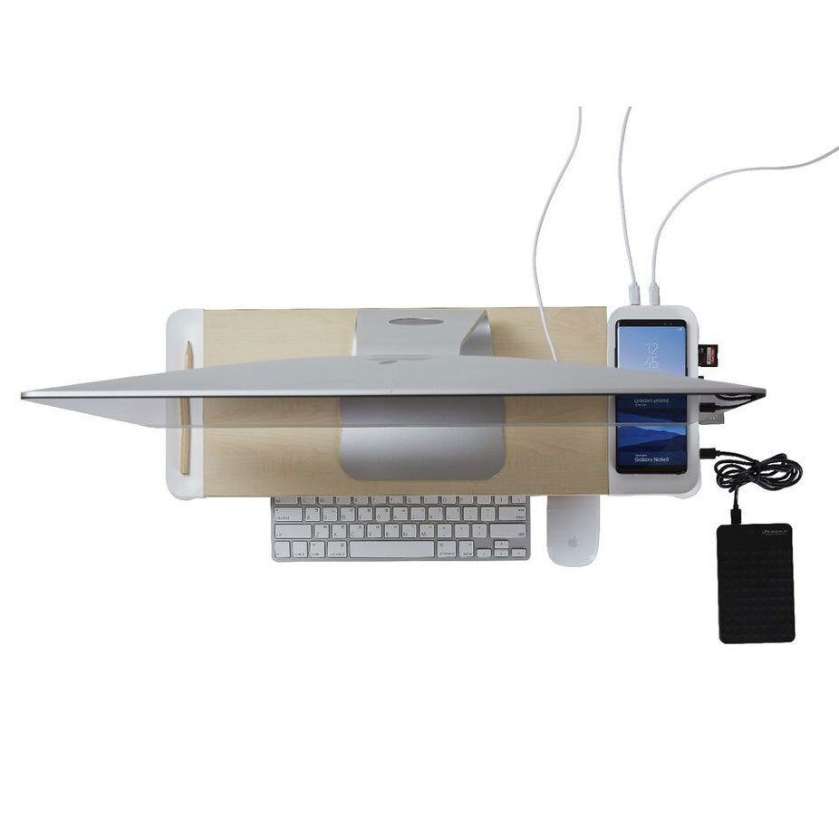 EYES 8 is the most advanced wooden monitor stand that provides multiple built-in combo which combine 15W super-fast wireless charging pad with USB Hubs supporting USB-C data port, USB 3.0 Hubs, and SD & microSD slots.