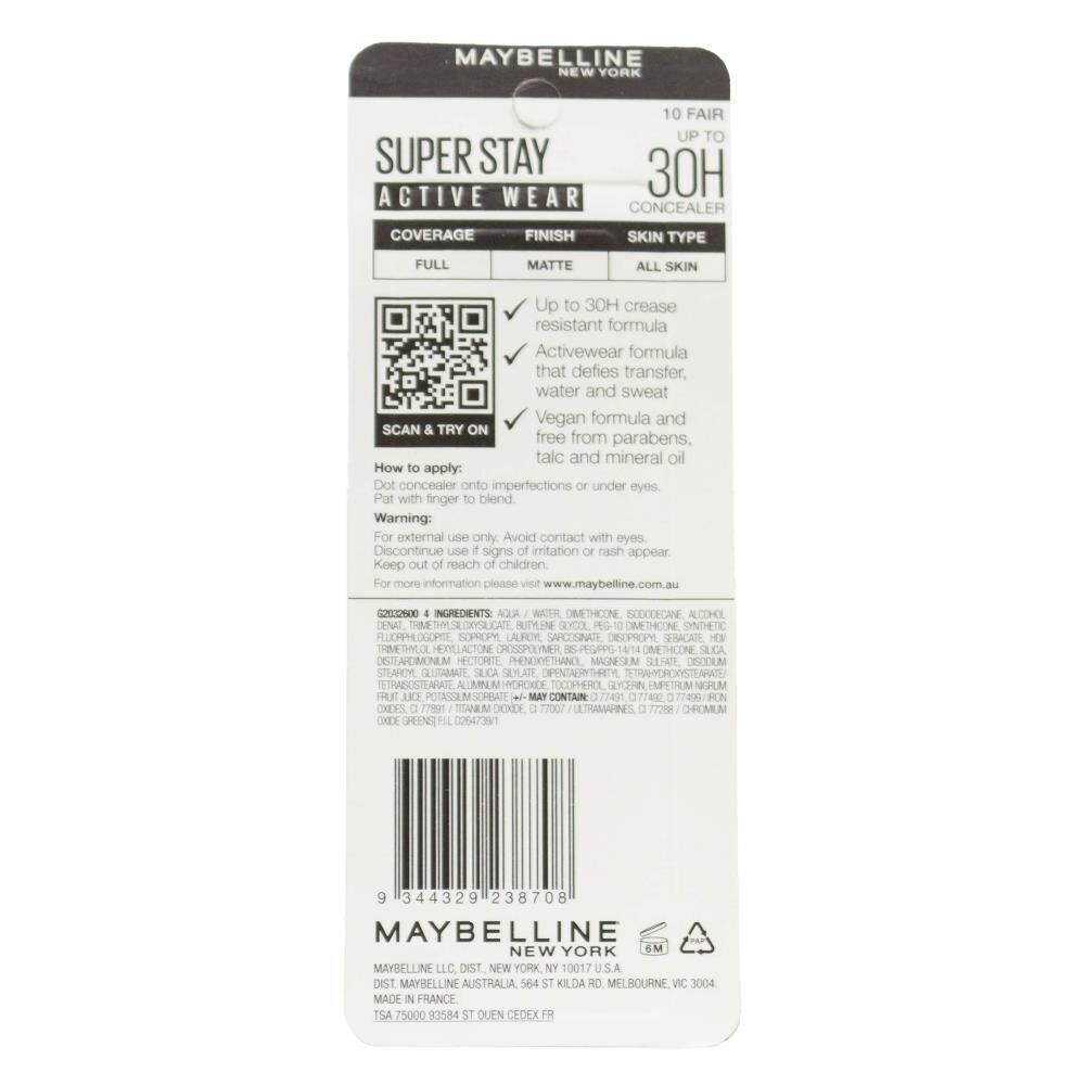 The Maybelline Super Stay Active Wear 30H Concealer in shade 10 Fair offers full coverage with a natural matte finish that lasts up to 30 hours. Its lightweight, breathable formula is designed to feel like second skin, providing comfort without creasing or caking. The concealer effectively covers dark circles and imperfections, making it ideal for all-day wear.