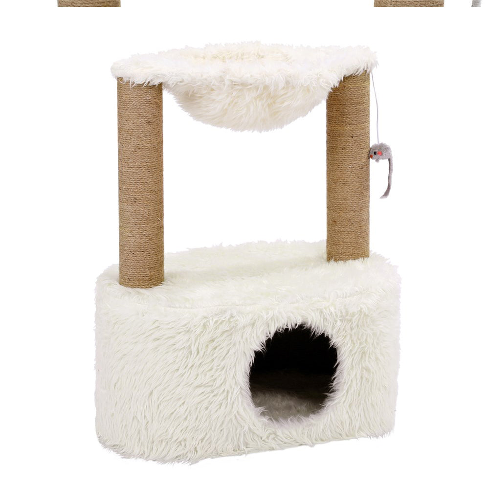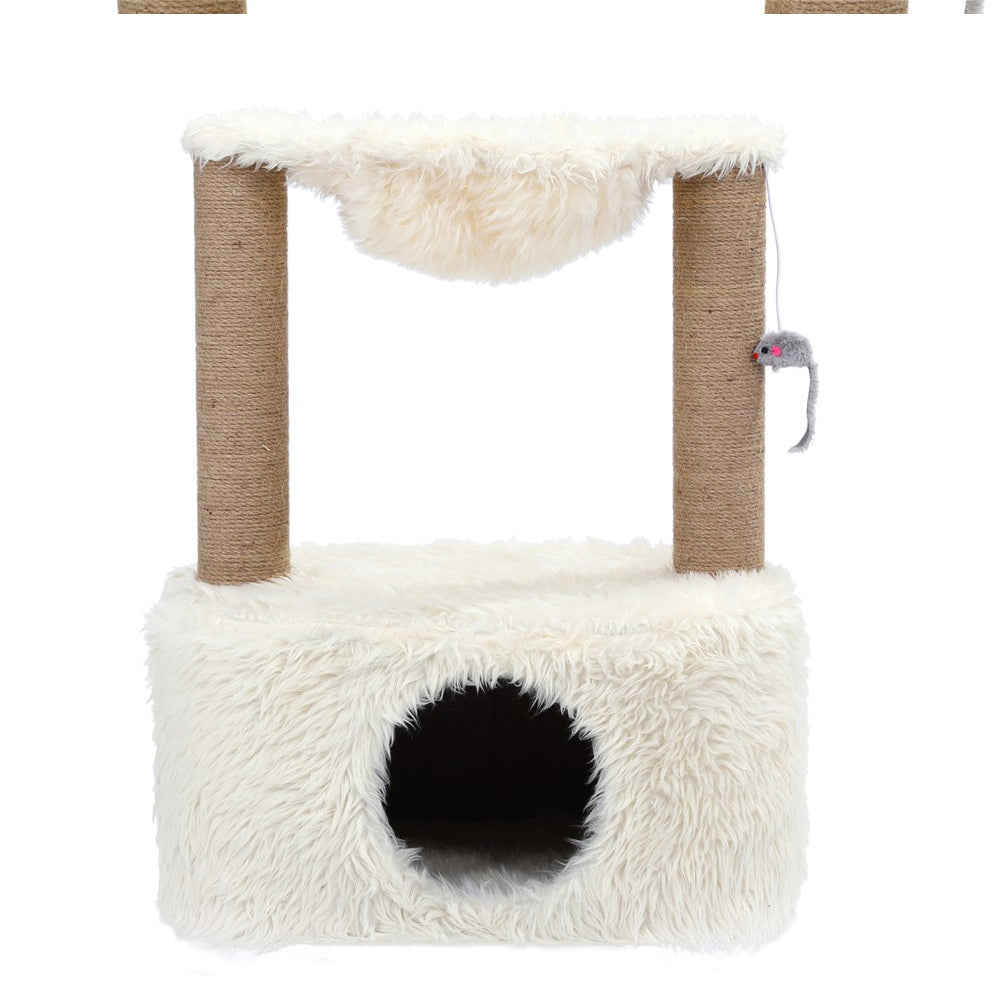 Support positive scratching behaviour with our Paws & Claws Catsby Middle Park Condo. Keep your cat entertained and occupied with this fun indoor activity. Our design is easy to assemble and features high quality long plush covering, natural sisal rope wrapped around both scratching posts and a hanging pompom for interactive fun - all ideal for deterring your pet from scratching any furniture. Our stylish design also features a comfortable plush bed, which makes this great for both rest and play!
