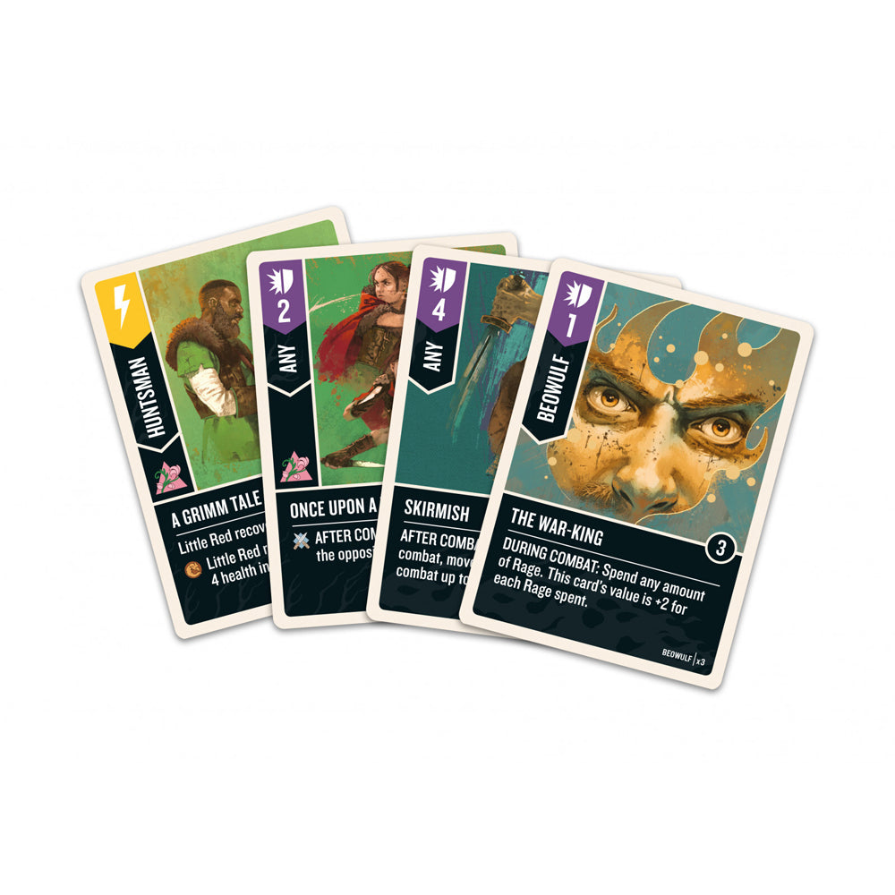 Little Red features a clever card-combo mechanism. Matching icons on the cards she plays to the one in her "basket" (discard pile), triggers potent effects. Meanwhile, Beowulf uses rage to power up his cards for devastating attacks.