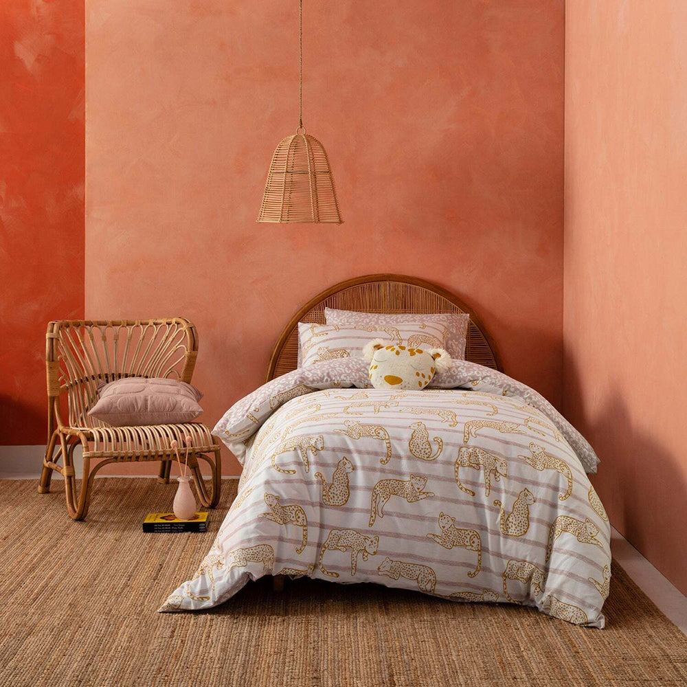 For all the cool cats and kittens out there, the Lazy Leopard quilt cover set makes a big cat statement. A print of hand-sketched leopards laze and play on sunny tree branches on the softest cotton. The reverse features a leopard skin print for a playful finish.