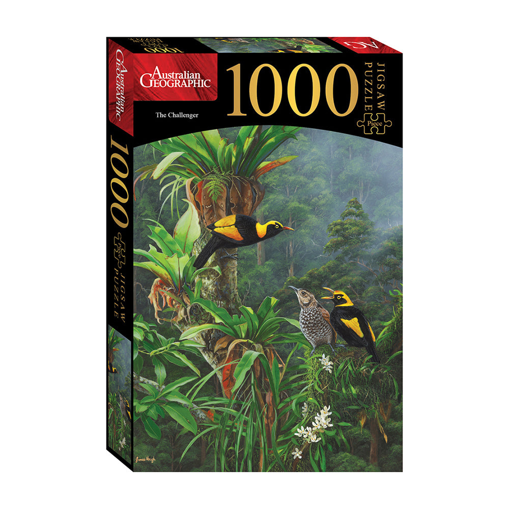 Fans of nature and the incredible work that Australian Graphic does will love putting together this 1,000 piece jigsaw puzzle. This whole series of jigsaw puzzles is incredible, but this one here that is called The Challenger really is something special. We have two Regent Bowerbirds ready to square off for the affections of a mate. It is a classic nature scene and something that has been captured perfectly here. The two males looking on trying to be dominating and the females unsure of which one to go for, it is fantastic stuff.