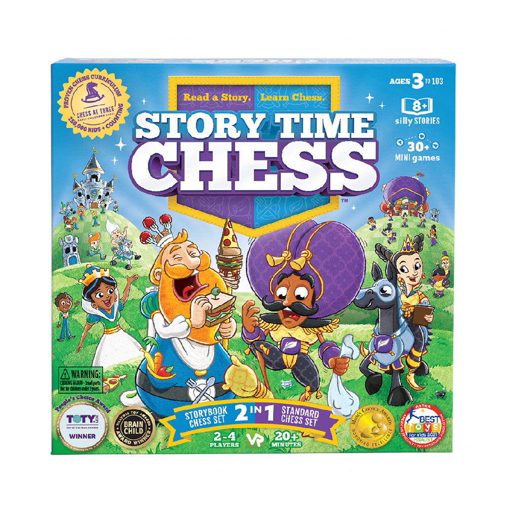 Story Time Chess is a board game that teaches chess to young children using silly stories, vibrant illustrations, custom chess pieces, and a unique chess board.