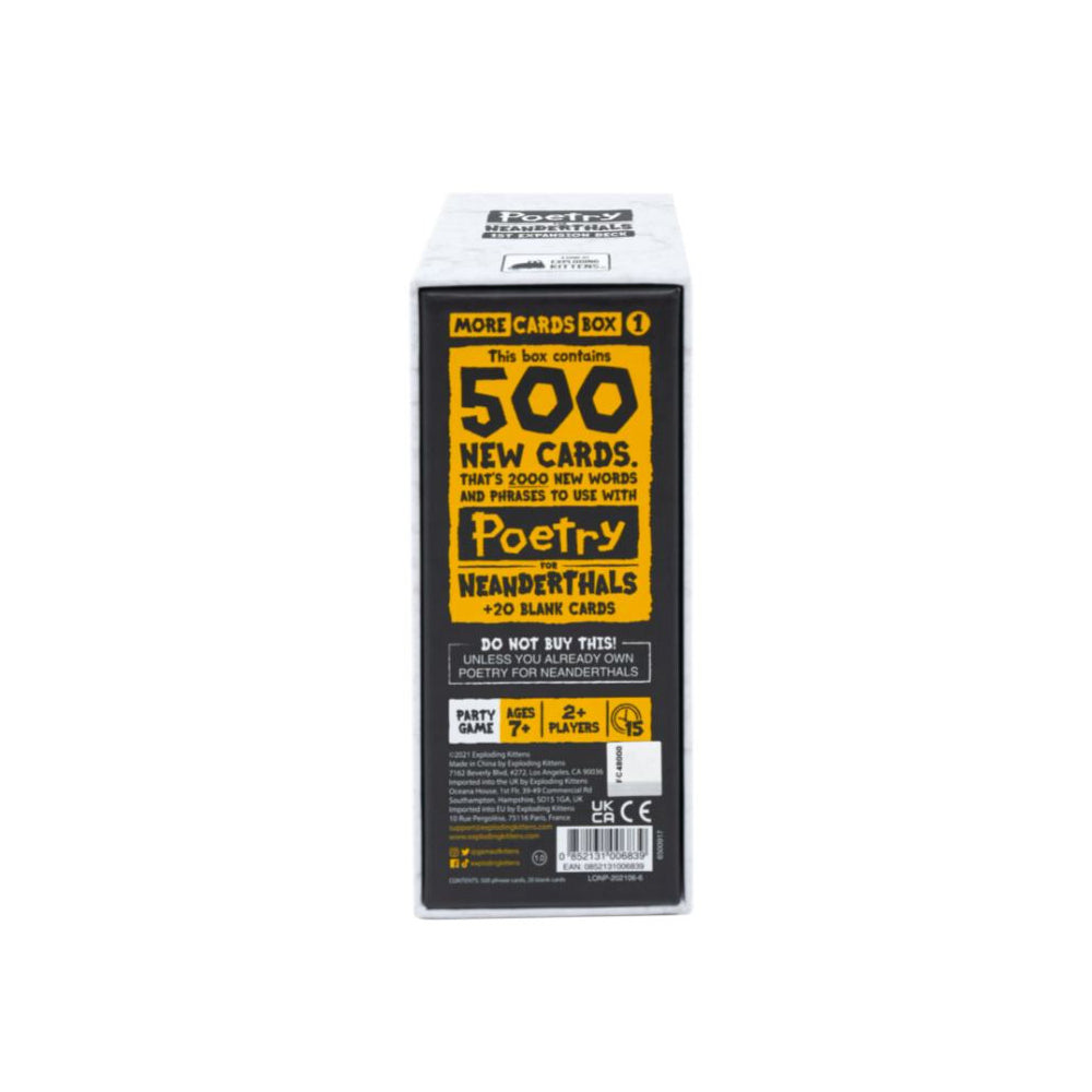 Introducing the 1st Expansion Pack for Poetry for Neanderthals - More Cards Box 1! Featuring 500 new cards and 2,000 new words and phrases, this expansion pack adds HOURS of gameplay to the core game. "