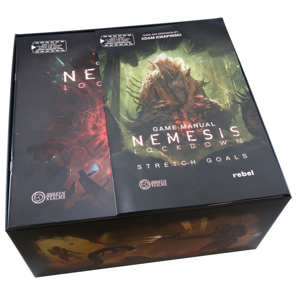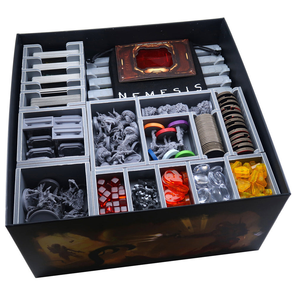 Insert compatible with Nemesis: Lockdown®, and includes space for the Nemesis Lockdown: Stretch Goal content. The design provides both efficient storage and improved game play. The trays can be utilised during the game, and they greatly aid set-up and clear-away times. The rules and boards act as a lid on top of the trays.