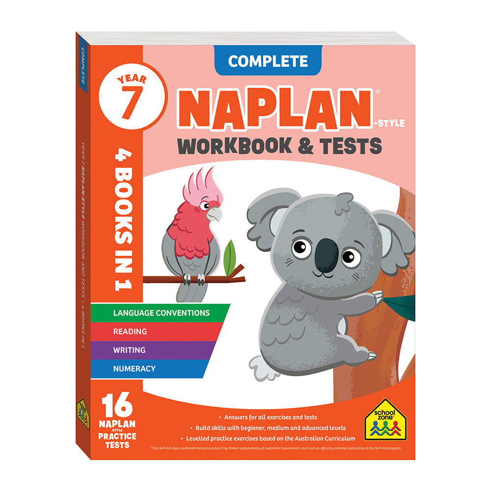 School Zone Complete Year 7 NAPLAN-style Workbook and Tests is packed with NAPLAN-style exercises and practice tests that will make learning fun and easy! The activities will help children get their best possible NAPLAN results in the four tested subject areas: numeracy, language conventions, reading and writing. Each carefully levelled practice exercise is based on the Australian curriculum, with answers for all exercises and tests included. With beginner, medium and advanced levels, everyone can be ready for NAPLAN!