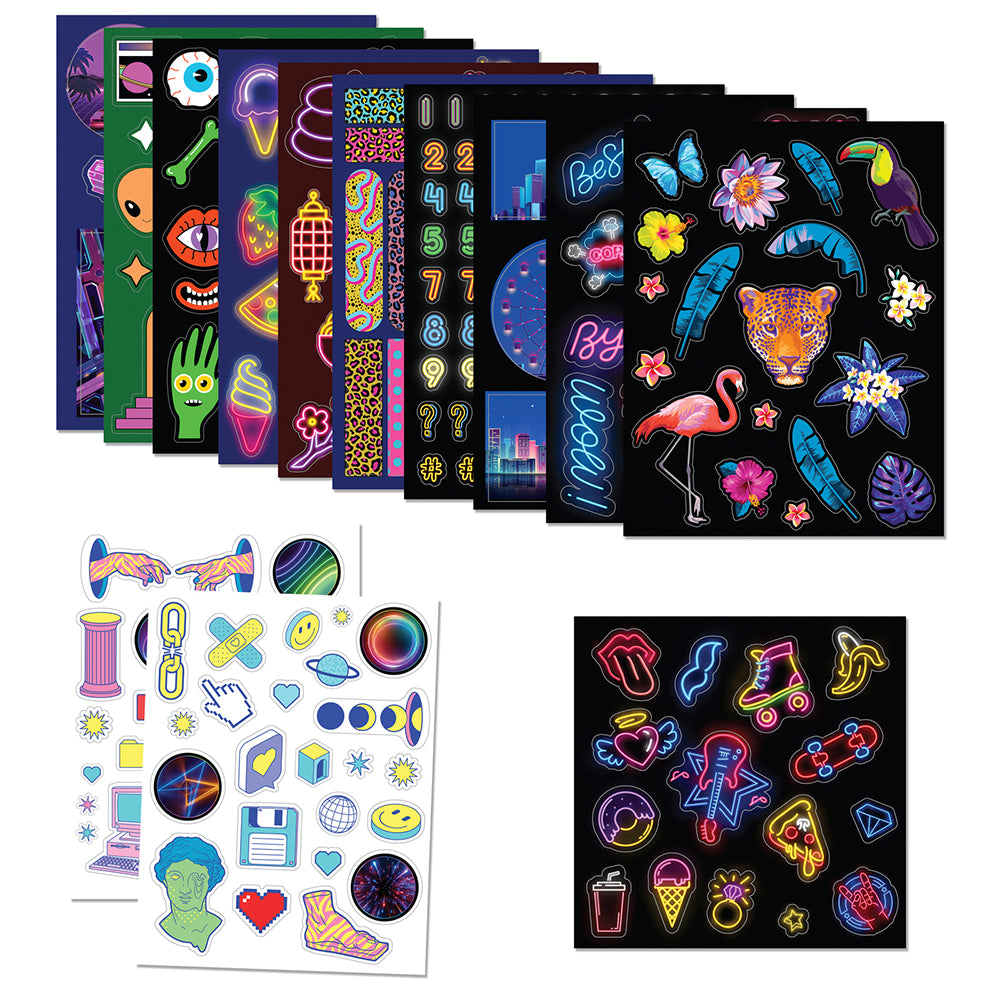 Deploy the 500+ stickers in this mega kit to bring explosive joy and personality to your world! With the included awesome project and inspiration book, you will learn all the tricks on how to layer up these cutest of stickers to make your own unique neon montage. From transforming notebooks to drink bottles and phones – it’s the bomb!