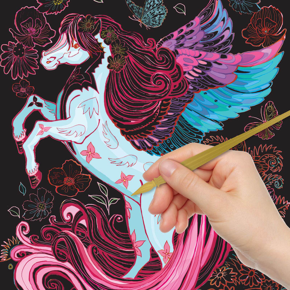 Kaleidoscope: Ultimate Etch Art Magical Creatures is an exciting way to explore your creative side and make fantastic art. Draw on the etch panels with the stylus to uncover the bright art underneath, making your pictures and patterns burst with life!