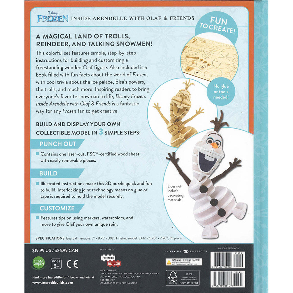 This colorful set features simple, step-by-step instructions for building and customizing a freestanding, wooden Olaf figure. Also included is a collectible booklet filled with fun facts about the world of Frozen, with cool trivia about the Ice Palace, Elsa's powers, the trolls, and much more. Inspiring readers to bring everyone's favorite snowman to life, IncrediBuilds: Disney Frozen: Inside Arendelle with Olaf and Friends is a fantastic way for any Frozen fan to get creative.