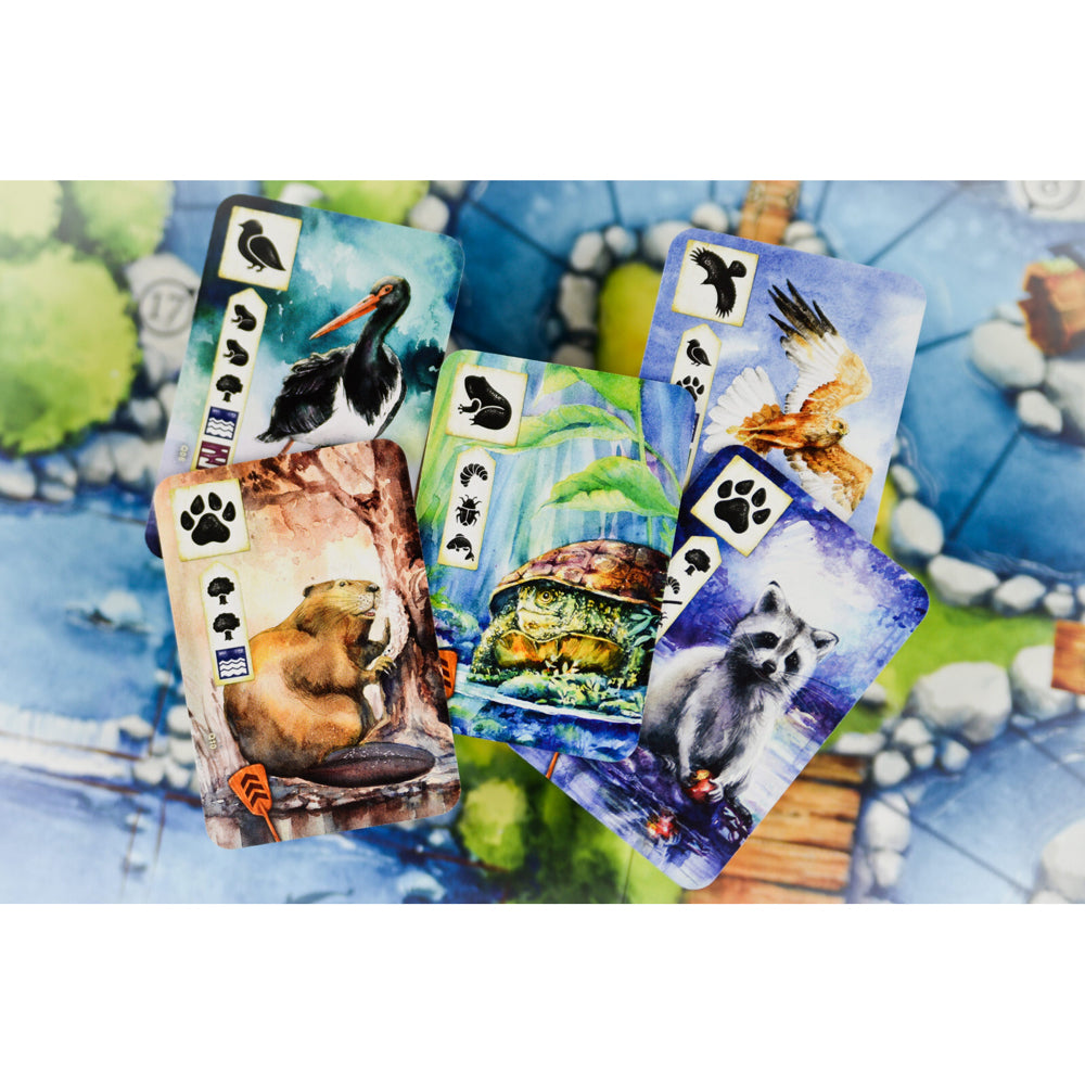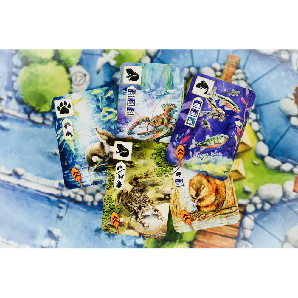 Meadow: Downstream includes over 80 new cards depicting wildlife living in an aquatic environment and a new thematic envelope to discover. Kayaking mechanism allows players to score extra points for progressing down the river. Adjust the level of competition with two-sided river board. Choose between a fast stream and calm river to explore two faces of nature.